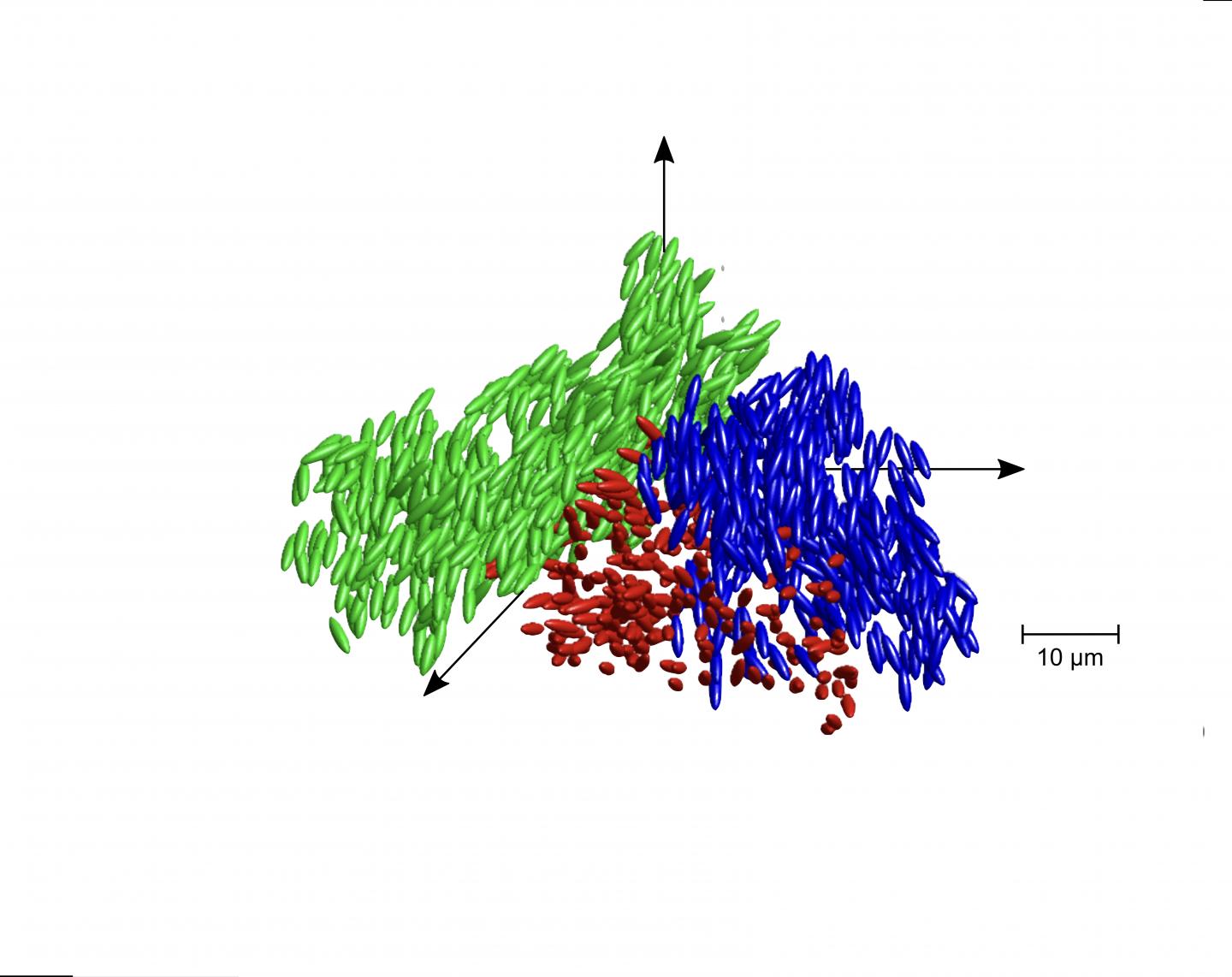 image: Image of the position and orientation of ellipsoidal particles in clusters of a liquid glass.