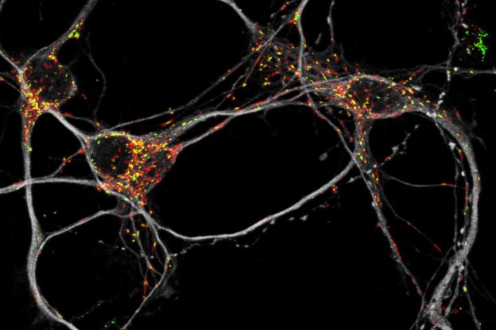 image:Â Microscopy image of mouse neurons (grey), with mitochondria labeled in red and green.