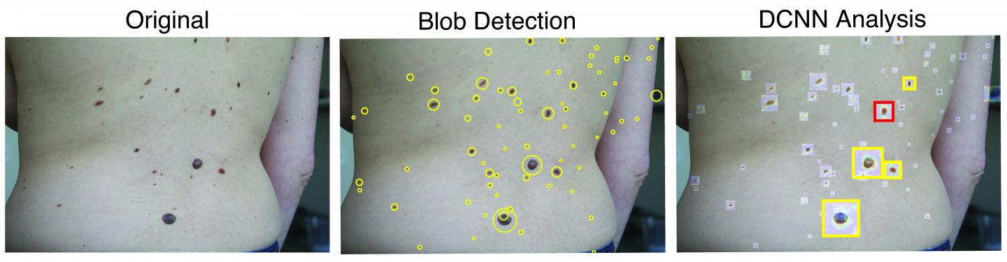 image: Example images with multiple lesions on the back of a subject. The neural network analyzes the images and classifies the lesions as nonsuspicious or suspicious (red). This material relates to a paper that appeared in the Feb. 17, 2021, issue of Science Translational Medicine, published by AAAS. The paper, by L.R. Soenksen at Massachusetts Institute of Technology in Cambridge, MA; and colleagues was titled, "Using deep learning for dermatologist-level detection of suspicious pigmented skin lesions from wide-field images."