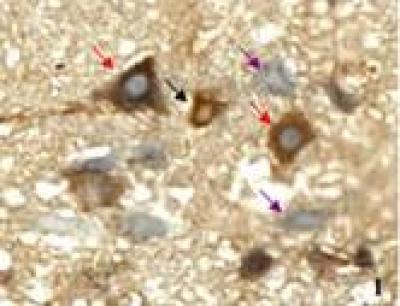 Cells co-labeled with both β-galactosidase and NeuN were seen in ischemia brain following transplantation of non-adherent bone marrow cell-derived mesenchymal stem cells from β-galactosidase transgenic mice (immunohistochemical staining, ×1000).