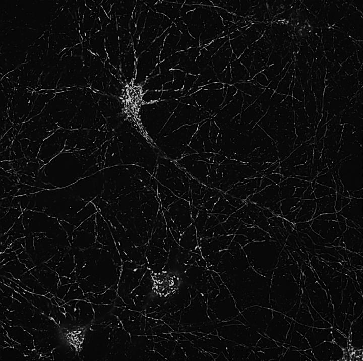 image: Mitochondria become fragmented in neurodegenerative disorders. Image shows cultured mouse neurons treated with a mitochondria-protecting compound. The mitochondria have become elongated relative to those in the untreated cells.