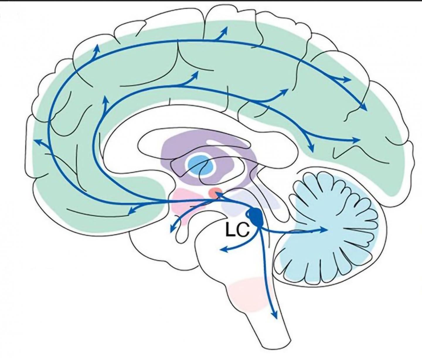 image: The Locus Coeruleus is deep in the brain but projects circuits throughout the organ.