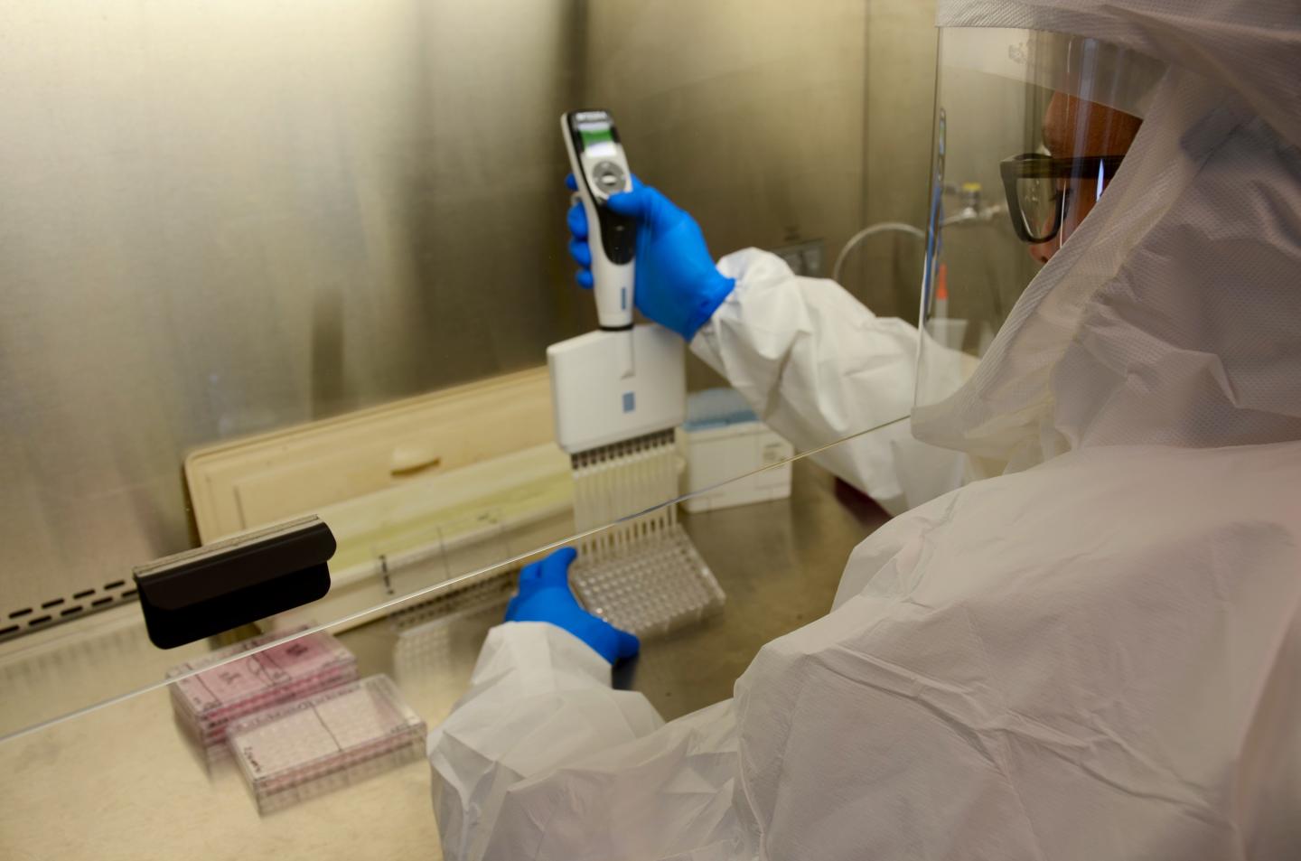 image: Dr. Timothy Sheahan in 2017 works in a lab at the UNC-Chapel Hill Gillings School of Global Public Health.