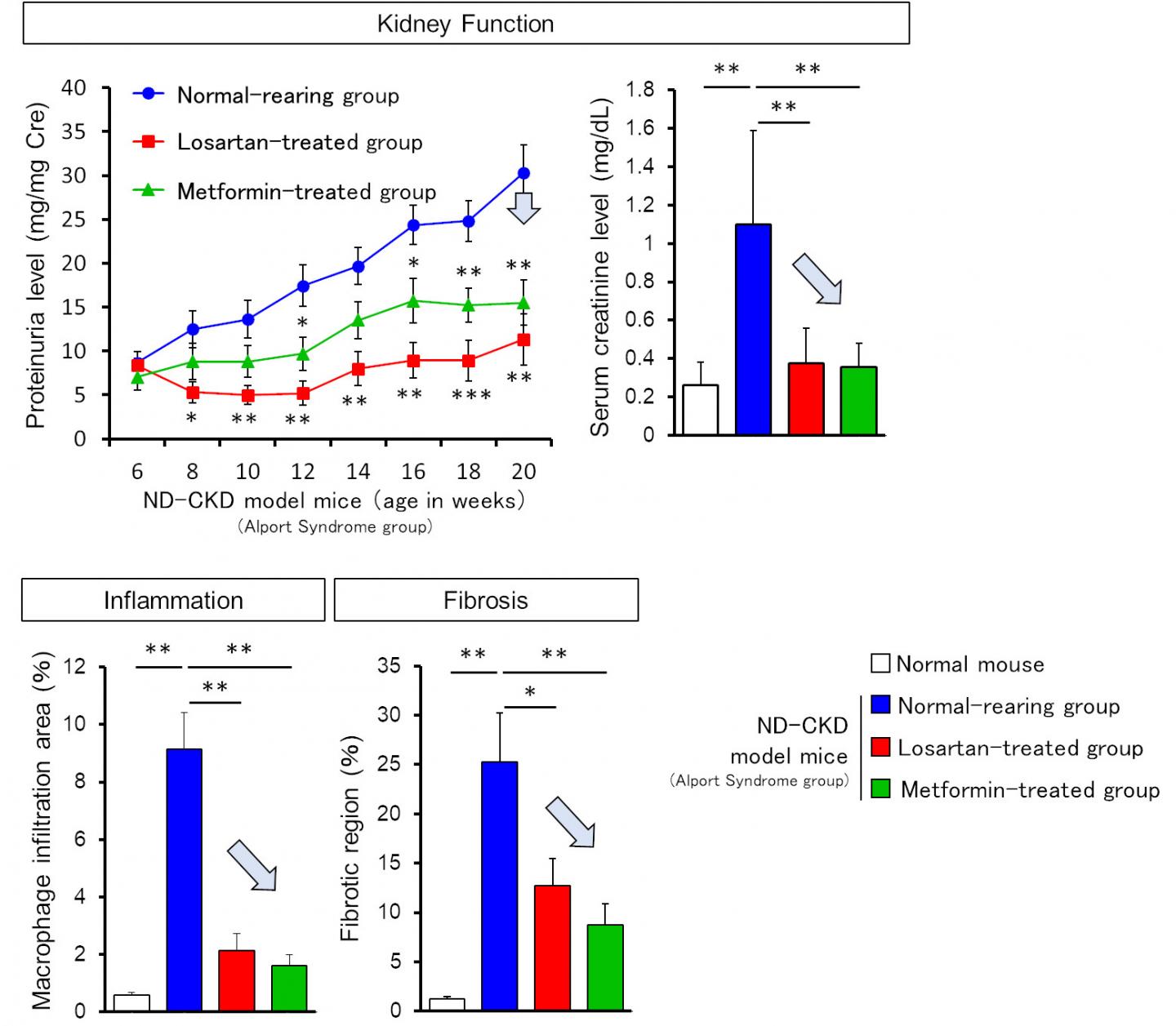 Administration of metformin or losartan to ND-CKD model mice significantly suppressed proteinuria and serum creatinine, which are indicators of CKD. Inflammation and fibrosis, which also reduce kidney function, significantly improved. Furthermore, metformin was found to have a nephroprotective effect similar to losartan.
