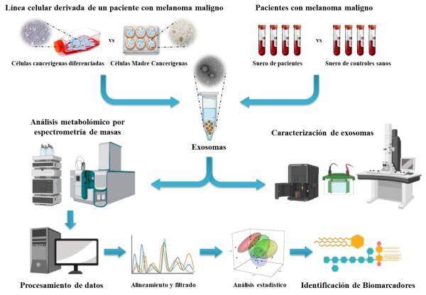 Subsequently, and following the same scientific approach, a similar study was carried out comparing the metabolomic profile of exosomes isolated from the blood of patients with malignant melanoma in different stages and healthy individuals who acted as controls. The study concluded that certain metabolites, including some of those previously identified in CSCs, were also present in exosomes isolated from blood in different concentrations among melanoma patients and healthy individuals. By means of the corresponding statistical models, these molecules and their different concentrations in blood made it possible to distinguish individuals with malignant melanoma from those without the disease. This makes them suitable candidates for acting as potential biomarkers for its diagnosis.