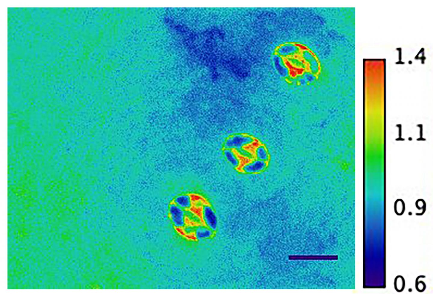 image: The image depicts three Arabidopsis leaf surface pores, or stomata, expressing the new SNACS stress nanosensor developed by UC San Diego plant biologists.