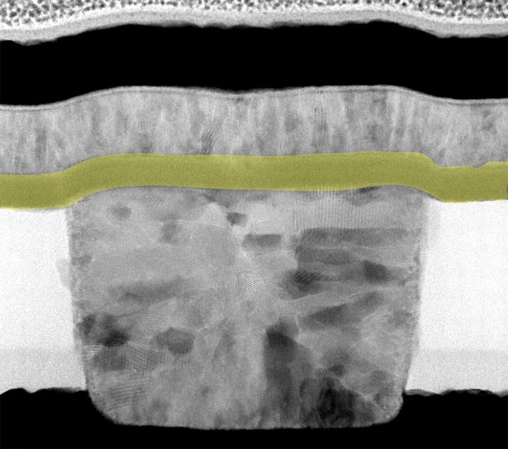 image: An electron micrograph of the artificial neuron. The niobium dioxide layer (yellow) endows the device with neuron-like behavior.
