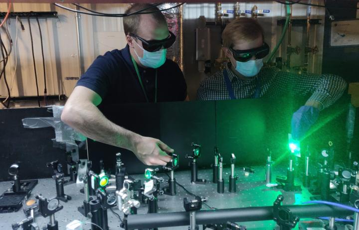 image: A new, highly versatile class of quantum dots excel as single-photon emitters, with applications in biomedical imaging, quantum communication, cybersecurity, and many other fields. Zachary (Zack) Robinson (left) and Vladimir Sayevich (right) are part of the team that has developed these infrared-emitting quantum dots.