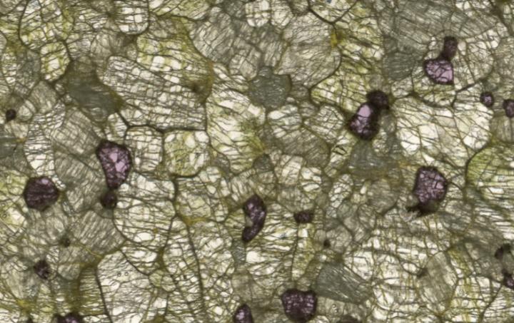 image: A transmitted light view through a 200-micron section of a peridotite sample, showing the three main minerals - olivine (clear-green), orthopyroxene (grey-green) and garnet (pink).