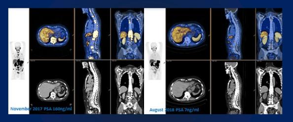 image: Marked reduction in metabolically active disease in response to a combination of 177Lu PSMA 617 + NOX66 therapy in end-stage, high-volume castrate resistant metastatic prostate cancer. The PSA continued to fall for 6 months after completion of therapy, and the patient remains well 20 months after trial enrollment.