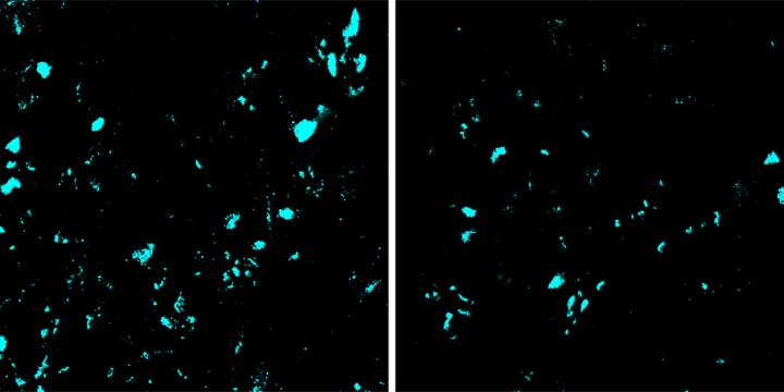 image: CRISPR base editing decreased the amount of a mutant protein (blue) that contributes to ALS in the spinal cord. Left, a spinal cord section from an untreated mouse. Right, a spinal cord section from an animal treated by base editing.