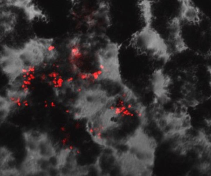 image: The honeycomb structure of human retinal pigment epithelial (RPE) cells with oxidative stress induced complement (C5b-C9) in red.
