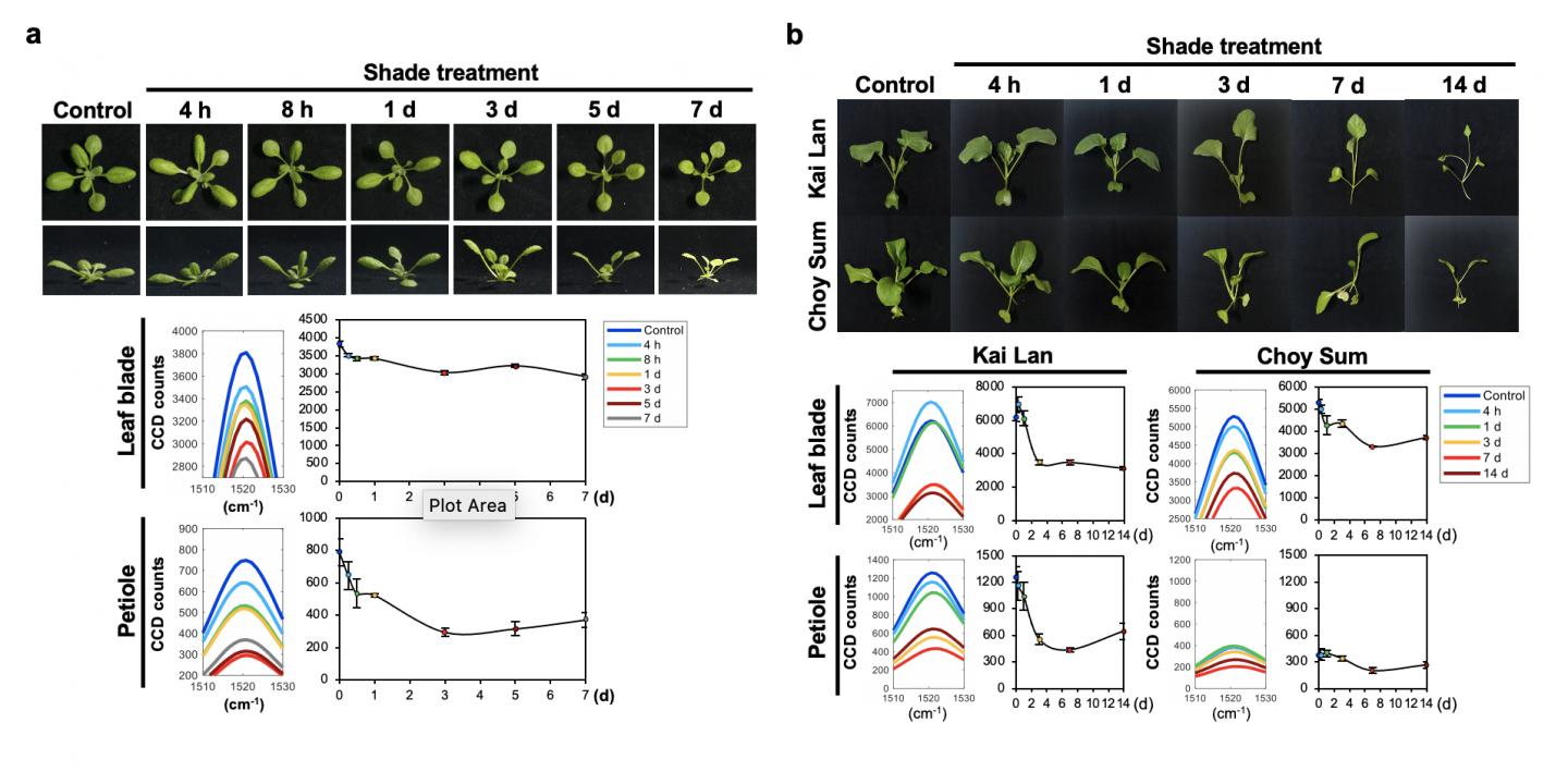 "We conducted our experiments on a number of edible plants, including frequently consumed Asian vegetables like Kai Lan and Choy Sum," said Mr Benny Jian Rong Sng, the paper's co-first author and PhD student from Dr In-Cheol Jang's group at TLL and Department of Biological Sciences, National University of Singapore. "Our results showed that Raman spectroscopy can be used to detect SAS, induced by shade as well as high-density planting. Regardless of the food crop, this technology can be applied to improve agriculture and to meet the nutritional demands of today's growing populations."