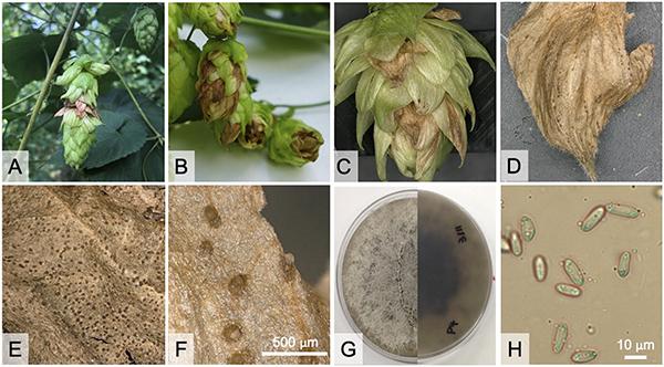 image: Signs and symptoms of a Diaporthe sp. 1-MI on hop cones
