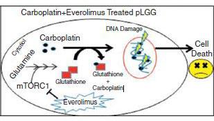 When treated with carboplatin alone, four different human cell lines of low grade glioma cancer cells did not respond to the drug or kept growing. Similarly, some cell lines were resistant to everolimus alone.