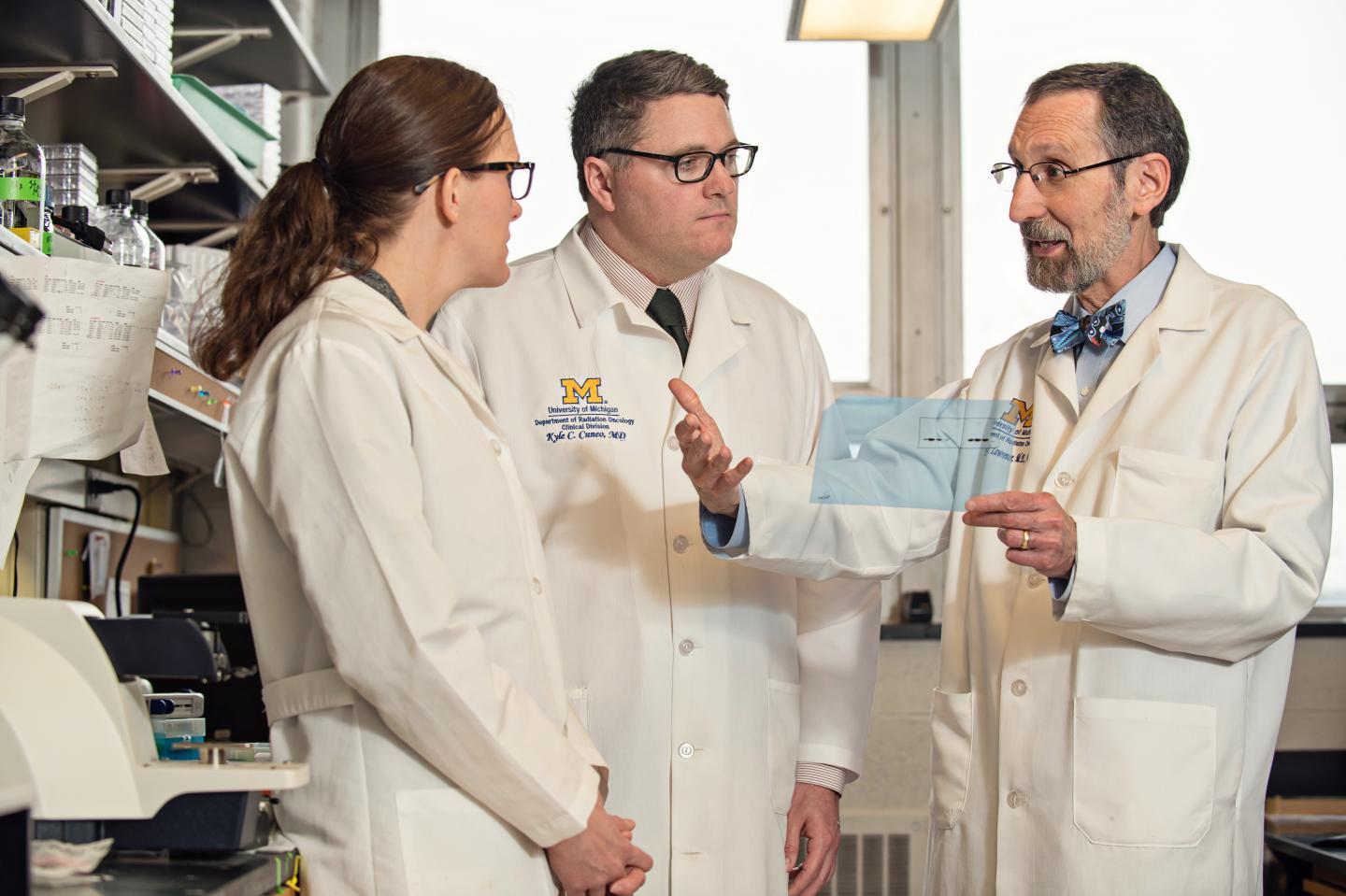 image: Meredith Morgan, Ph.D., Kyle Cuneo, M.D., and Ted Lawrence, M.D., Ph.D.