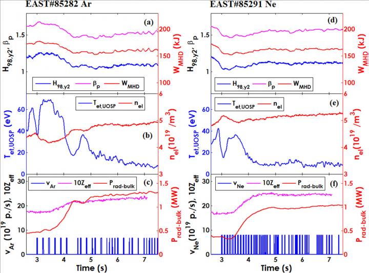 Recently, the EAST group of Institute of Plasma Physics, Hefei Institutes of Physical Science (HFIPS), reported their new findings about the influence of different impurity gases (Ar and Ne) seeding on the divertor plasma state and the core plasma confinement.