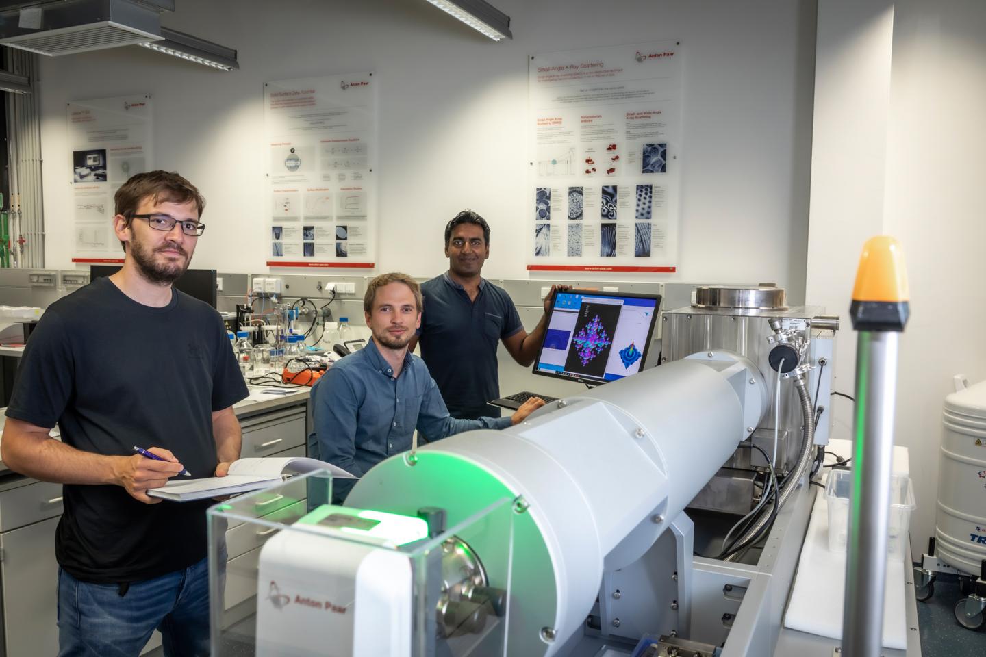 image: Harald Fitzek, Christian Prehal and Qamar Abbas (from left) at the SAXS facility SAXSpoint 2.0 (Anton Paar GmbH): With their work at Graz University of Technology, the researchers are providing new insights into hybrid supercapacitors.