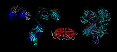image: A computer-generated image of a meganuclease (center), an antibody (left) and the gene-editing enzyme CRISPR-Cas9 (right). The light-colored ladder-like structures in the meganuclease and Cas9 images are the double helices of DNA in the genes they each target.