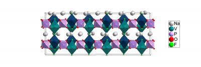 image: The low-temperature structure of NVPF [Na3V2(PO4)2F3] solved in this work. Calculations from Lawrence Berkeley National Laboratory suggest that the sodium atoms (white) can move most easily in the planes between the cation sites of vanadium (teal) and phosphorus (mauve) atoms during battery use.