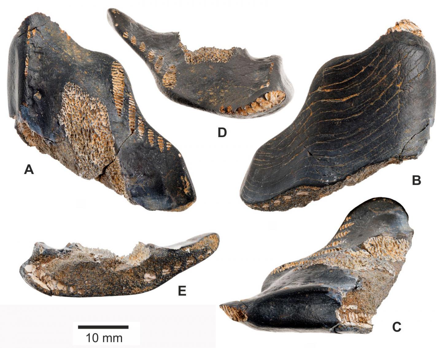 image: Canadodus suntoki, gen. et sp. nov., RBCM.EH2014.065.0001.001, left mandibular (L?=?50?mm, Km?=?19?mm) plate from the Sooke Formation of Vancouver Island, British Columbia. A, B, photographs of A, occlusal and B, labial views; C, D, line-drawing interpretations with terminology and measurements applied to C, occlusal and D, labial views; E, photograph.