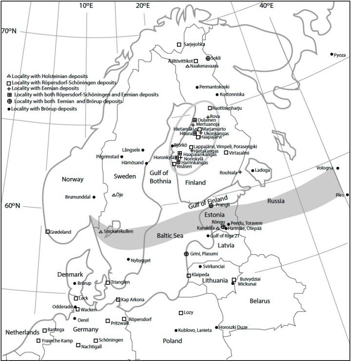 image: Map showing the localities in NW Europe and Fennoscandia where deposits representing the different warm intervals during the last 420,000 years of Ice Age are preserved. The grey ellipsoid indicates the location of the revised localities in the study. The thick grey W-E zone shows the approximate position of the inferred northern limit of boreal pine forest in the Late Brörup temperate interval c. 100,000 years ago.