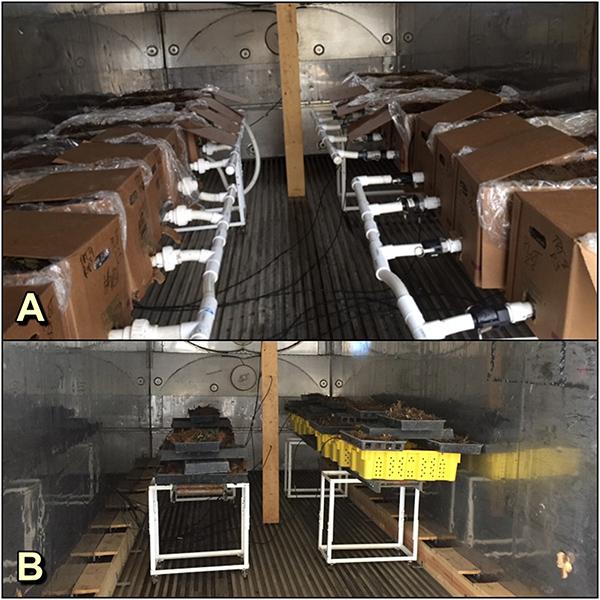 image: A, The precision thermotherapy unit setup for the high-elevation nursery trial in 2016. The extended setup allowed treatment of 18 boxes and employed four vacuums. B, The setup used for the trials run at Escalon and Ballico in 2017. A similar setup was used for the grower-run trial in 2018.