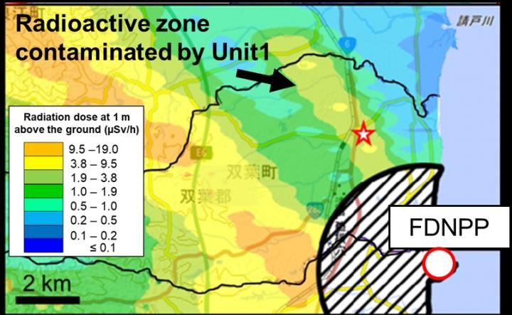 image: A map showing the location of the Fukushima Daiichi Nuclear Power Plant (FDNPP) and the sampling site against the radiation dose at 1 m above the ground as of November, 2017. The red star represents the location of the soil sample containing the highly radioactive particles.