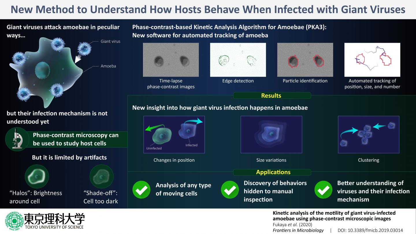 More importantly, in a brand new study published in Frontiers in Microbiology, a team of scientists at Tokyo University of Science, once again led by Prof Takemura, tried to understand the behavior in which amoebal cells infected with different types of giant viruses. For this, they devised a new cell-tracking method that tackles the issues of conventional analysis methods. Prof Takemura elaborates on the motivation of the study, "Our aim was to understand how giant viruses infect amoebae in the natural environment and how this has affected to evolution of eukaryotes. For this, we wanted to develop a technique to quantitatively detect the time-dependent, sequential changes in cellular number, size, shape, and direction and distance of cell motility."