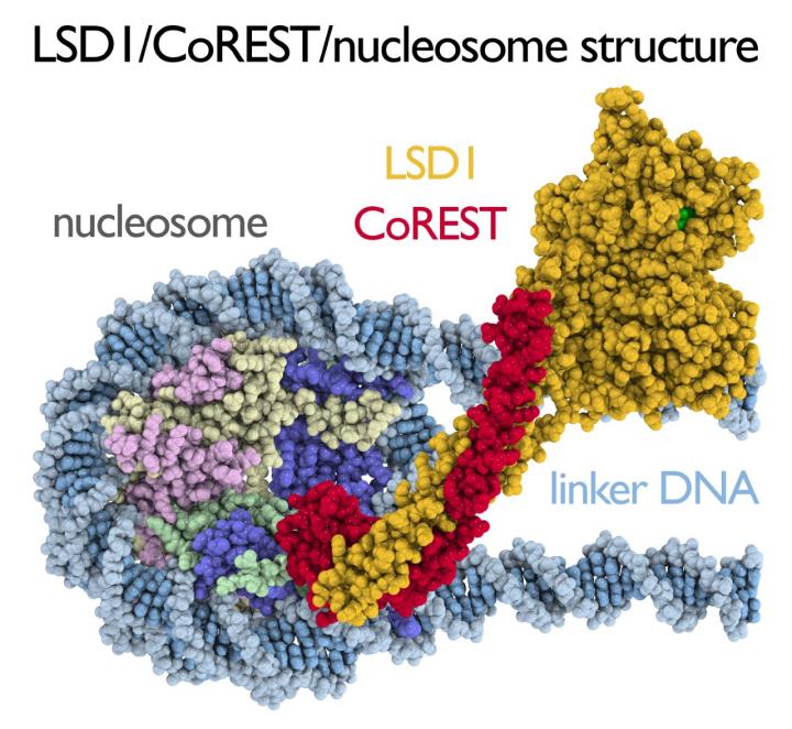 The enzyme, LSD1, can "turn off" gene expression by removing chemical flags (methyl groups) from the nucleosome--tightly packed units of DNA and protein in chromosomes. This LSD1 histone demethylase is over-expressed in multiple cancer types, resulting in disruption to normal cell development, and the new structure could inform therapeutic interventions that target the enzyme.