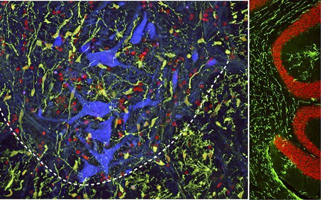 image: A micrograph shows effective migration of subpially injected human oligodendrocytes (a type of support cell in the central nervous system, colored here in green) into the spinal cord gray matter (left) and into the cerebellum (right) of an immunodeficient rat. Red indicates signal for oligodendrocyte marker; blue is signal for neuronal marker.