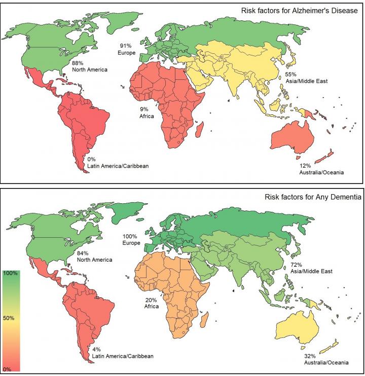 image: Percentage of reviewed dementia risk factors for which evidence is available from different geographic regions of the world.