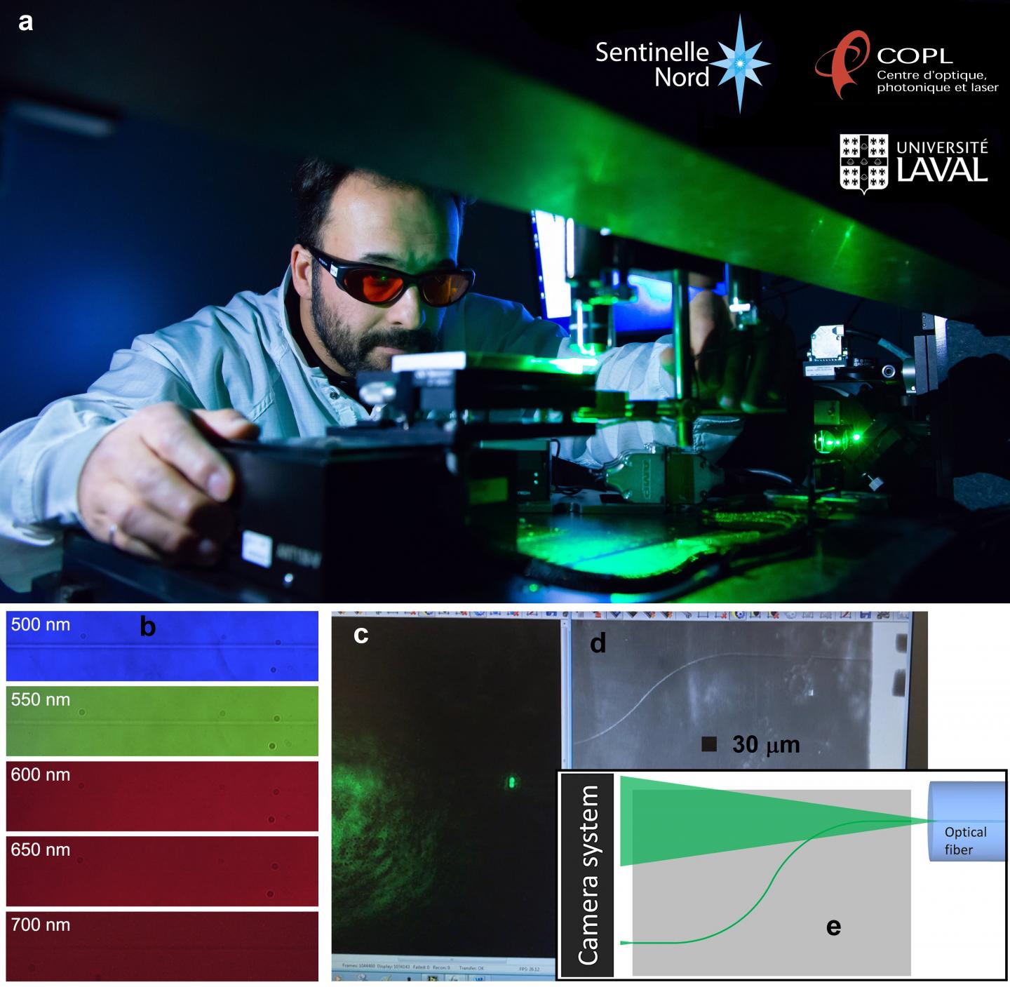 image: a, the ultrafast laser writing setup. b, microscope images of the top view of a laser-written waveguide (the horizontal line) in ZnSe crystal, seen through different colours. The waveguide becomes practically invisible in the red part of the spectrum (around 625 nm). c, d, e, the light information is guided through a curved waveguide with a radius of curvature of 363 μm. Three-dimensional waveguides with submillimeter bends were not achieved before this work. The images are part of a video available in the Supplementary materials of the article published in Light: Science & Applications. The curved waveguide laser-written in GeS4 glass (d, microscope image of the top view) is schematized in (e) where a part of the green light from an optical fiber enters in the waveguide. The output of the light can be seen on the camera system (c). The bright spot on the right shows the strong guidance of the curved waveguide.