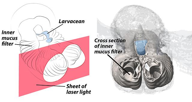 image: These illustrations show how a sheet of laser light from the DeepPIV system illuminates the inside of a larvacean filter, revealing internal structures.