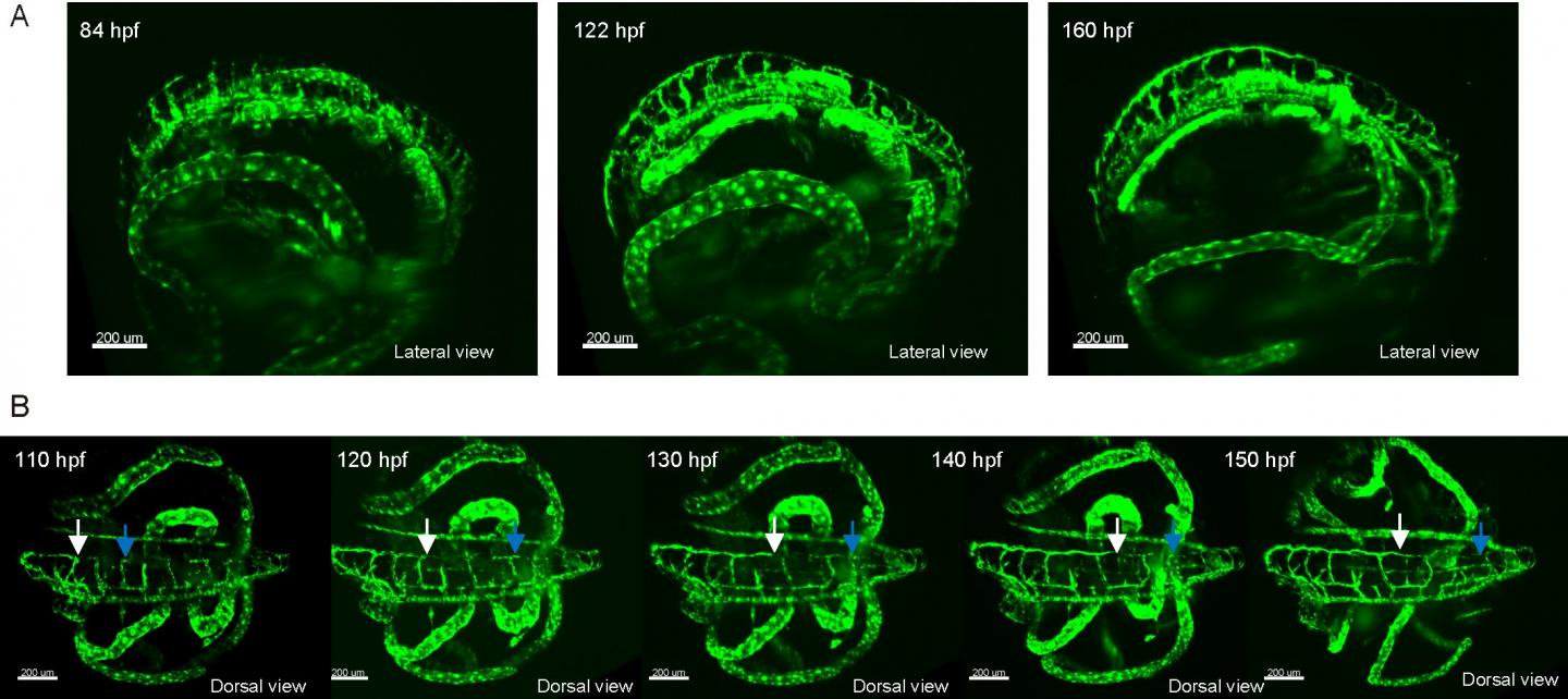 image: Observation of a lymphatic vessel development over three days using a FLT4-EGFP embryo which expressed green fluorescent protein in the lymphatic endothelial cells.