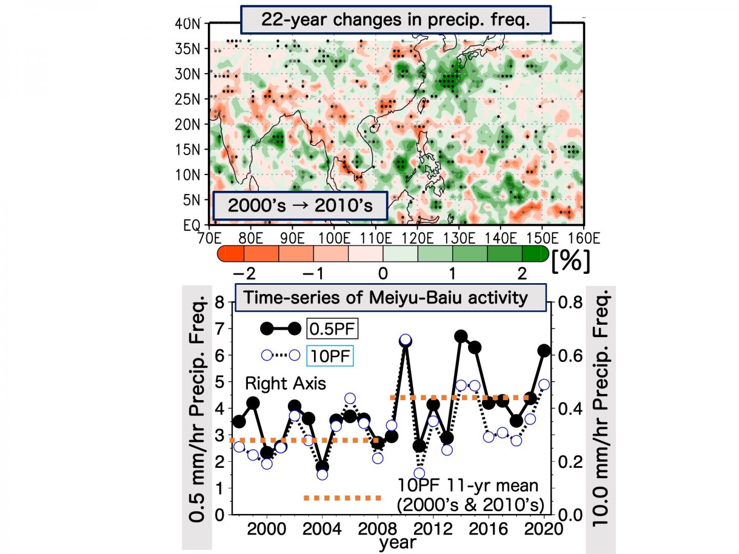 image: (upper) Changes in rainfall levels between the 2000's and the 2010's. (lower) Frequency of precipitation (0.5mm/hr) and heavy precipitation (10.0mm/hr) during the Meiyu-Baiu season over the years.
