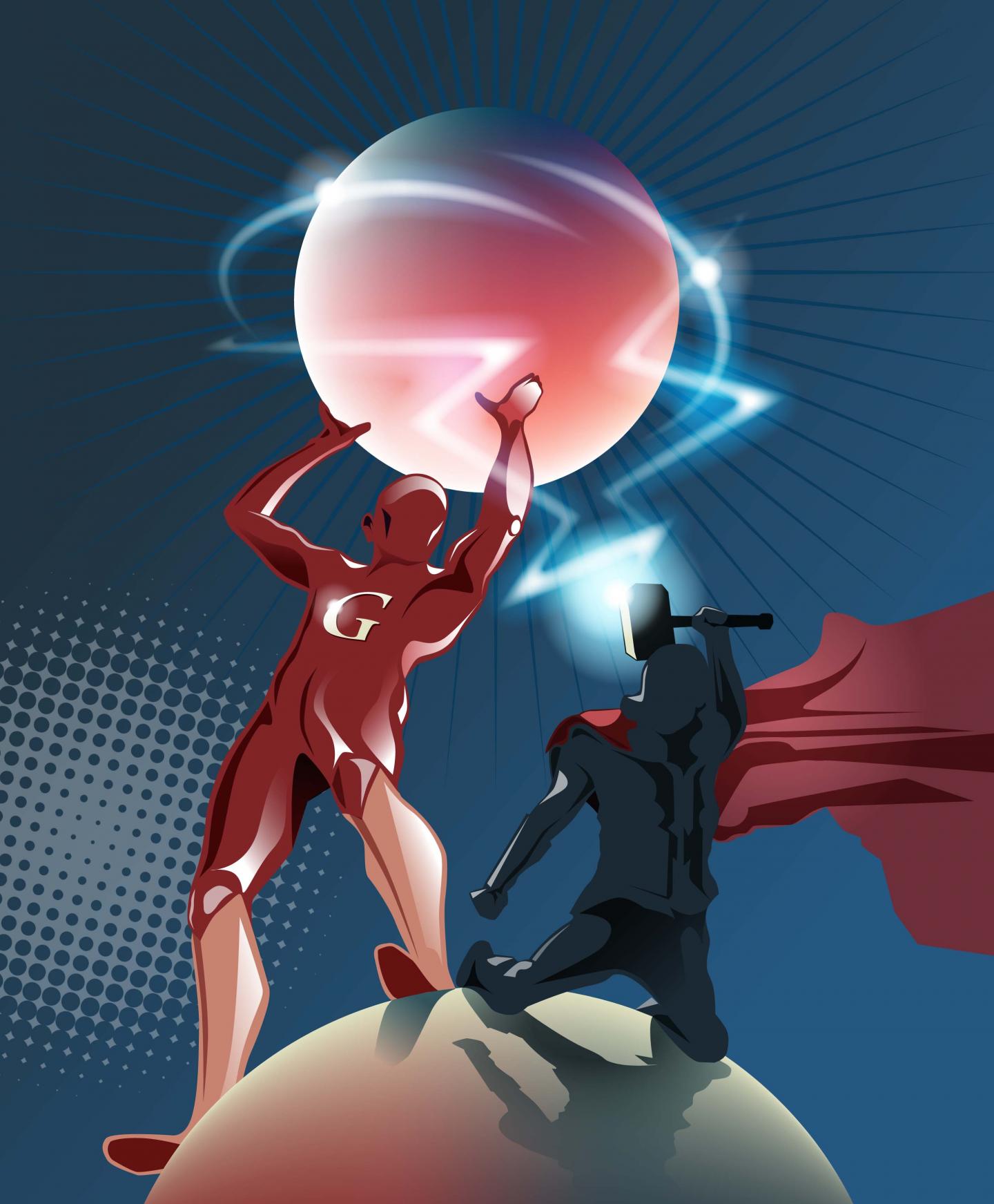 image: The comic illustration shows G3BP (G) tethering the TSC complex to a lysosome, thereby preventing the MTOR (aka Thor) signaling protein from becoming active