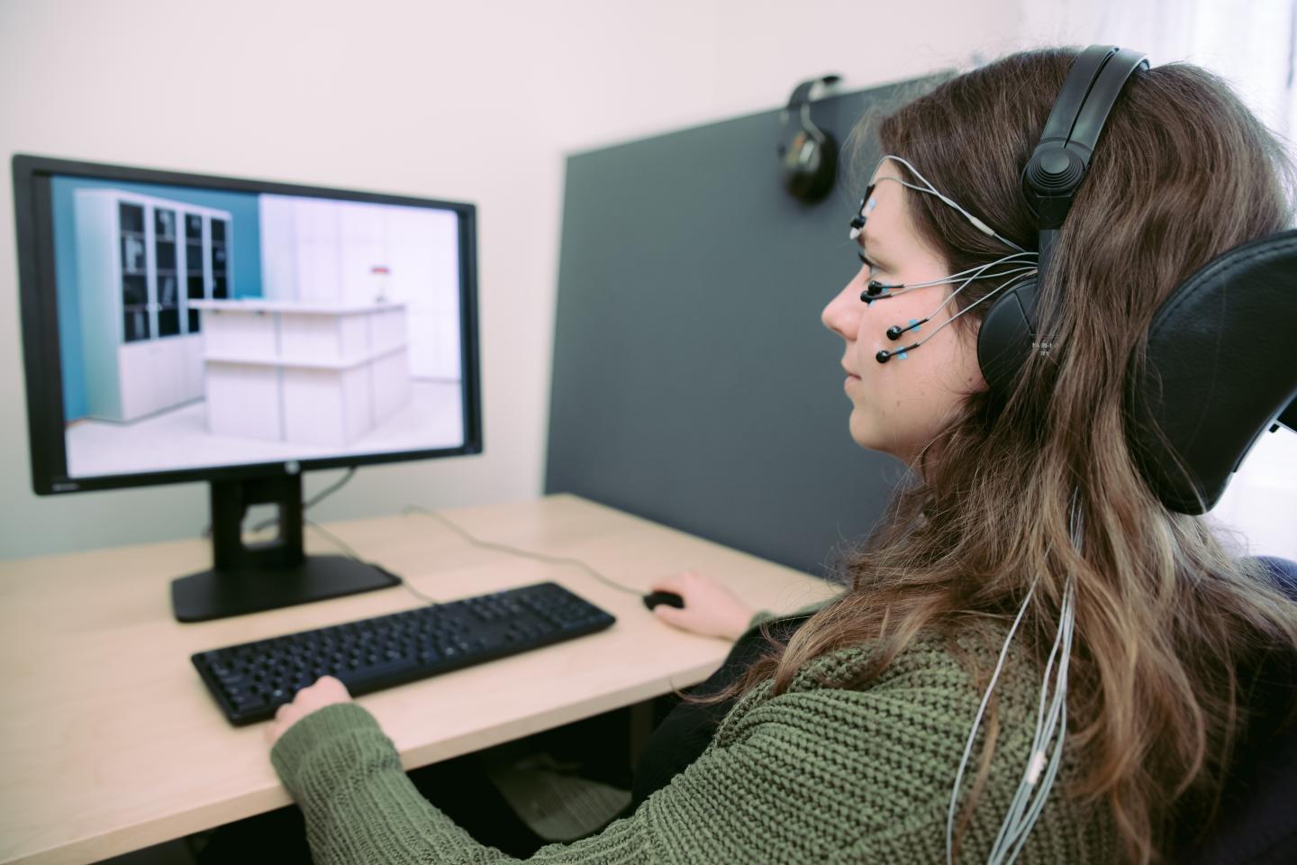 image: When the lamp in the figure is red, the subject hears an unpleasant sound in the earphones and learns to associate the visual signal with discomfort.