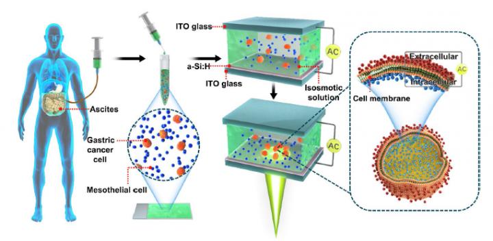 The researchers fabricated a novel OEK-based microfluidic chip to separate live gastric cancer cells from patients' ascites and characterize their electrical properties. They established polymerization model of cells and solution model of cell membrane capacitance.