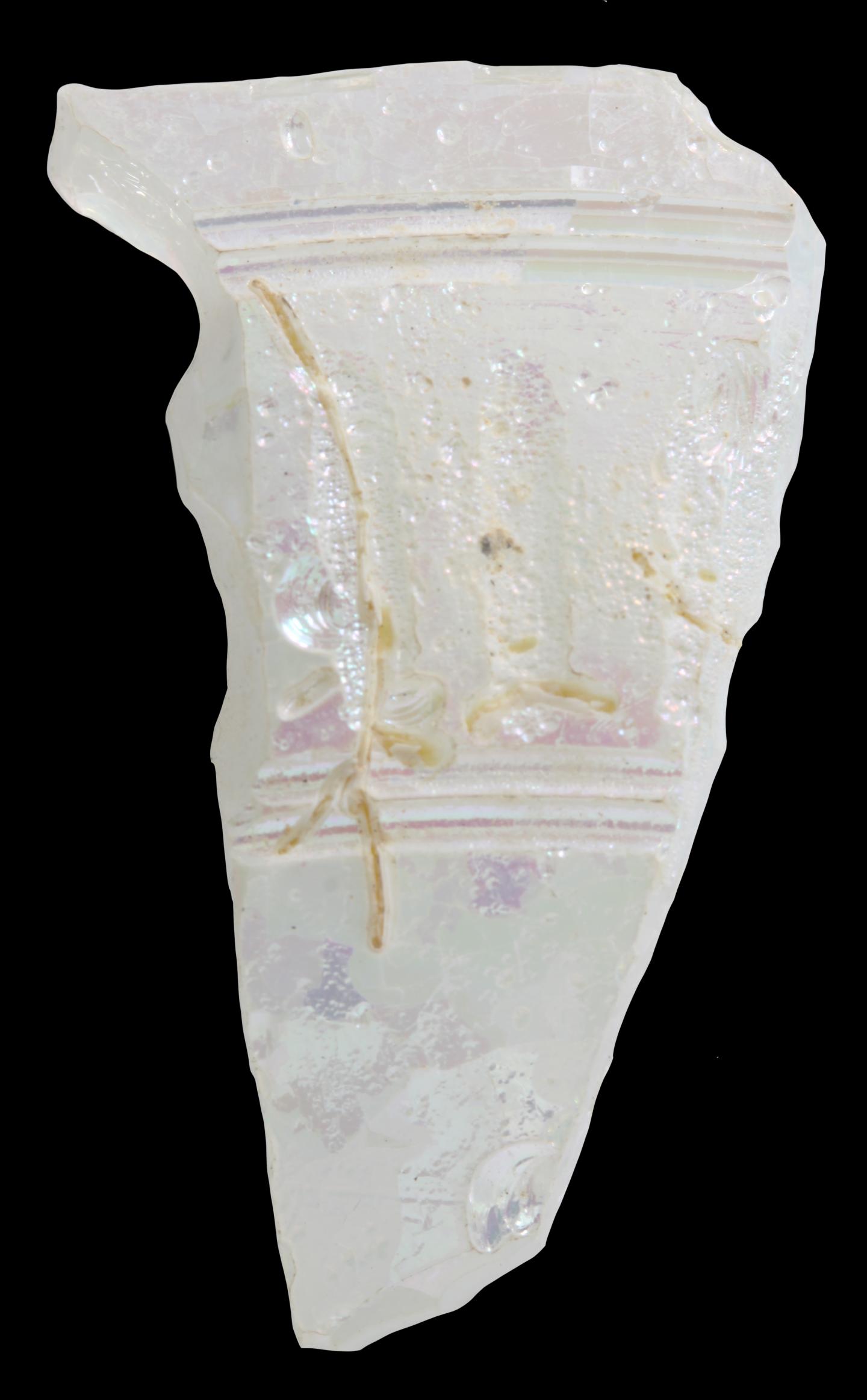 image: One of the colourless Roman glass sherds from Jerash, Jordan, analysed in this study. Purple splashes are iridescence due to weathering.