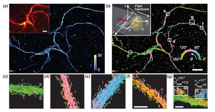 image: Researchers developed a microscopy technique that measures the location and orientation of single molecules and used it to study the structural details of amyloid protein aggregates. (a) Single-molecule localization microscopy image of a network of amyloid aggregates. (b) Image showing Nile red binding orientations to amyloid surfaces, color-coded according to the average orientation measured within each bin. (c-g) Individual orientation measurements localized along fibril backbones within the white boxes in (b). The lines are oriented and color-coded according to the direction of the estimated angle. Horizontal white scale bars are length markers, 1 micron in (a), (b) and 100 nm in (f), (g).
