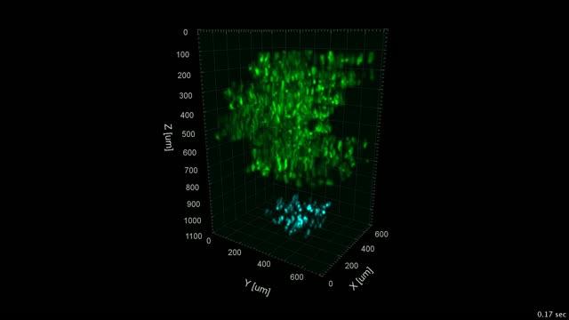video: Using a new microscopy technique researchers simultaneously recorded from the cortex (green) and hippocampus (blue) of a mouse brain. Bright areas correlate with cell activity.