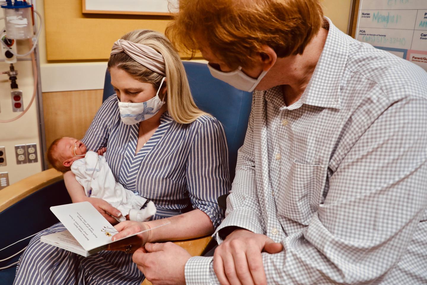 image: Enoch's parents, David and Mackenzie, enjoy reading to him while he recovers in the NICU at Cincinnati Children's.