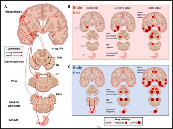 "It is known that PD patients of the body-first type are at an increased risk of developing dementia. According to the SOC model this increased risk follows from the fact that, at the time of a PD diagnosis, the alpha-synuclein pathology is more widespread, more symmetrical, and shows more involvement of certain brainstem neurons, which are themselves involved in cognitive decline and dementia," Dr. Borghammer added.