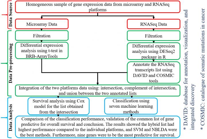 When compared to the gene list from each of the individual platforms, the researchers noted that the hybrid gene list had the highest accuracy, sensitivity, specificity, and AUC for mutation status, across all the classifiers and is prognostic for survival in patients with CRC. Negative binomial linear discriminant analysis method was the best performer on the RNASeq data while the SVM method was the most suitable classifier for CRC across the two data types. The researchers concluded that nine genes were found to be predictive of survival.