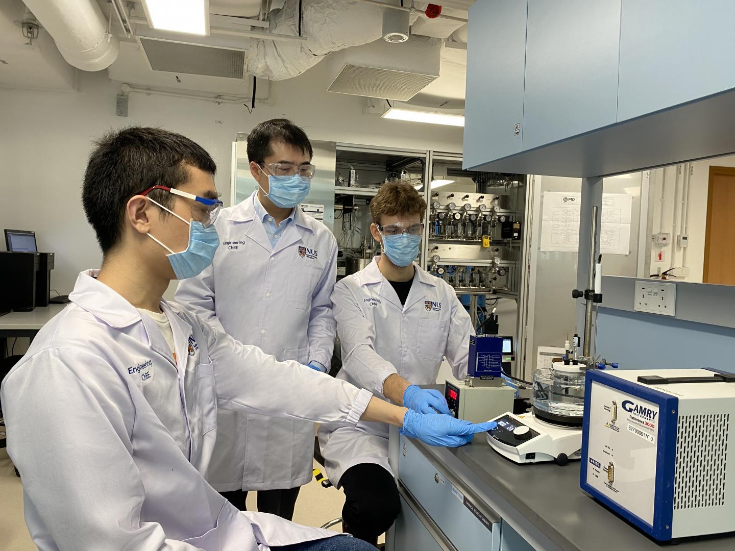 image: The NUS research team led by Assoc Prof Yan Ning (middle) used an electrostation machine to achieve the desired oscillation of electric potentials in order to speed up hydrogenation in a laboratory-scale reactor. With him are two members of the research team: doctoral student Mr Lim Chia Wei (left), and Research Fellow Dr Max Hulsey (right)