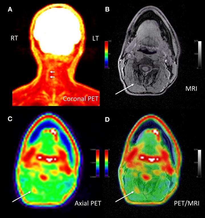 image: Adult male with decades of right neck pain, discomfort and tightening following birth injury. The patient had failed multiple standard therapeutic maneuvers before presenting for 18F-FDG PET/MR imaging. Images shows abnormally elevated FDG uptake (white arrows; SUVmax = 1.2) observed in a linear pattern in the space in the posterolateral right neck, between the oblique capitis inferior and the semispinalis capitis muscles, where the greater occipital nerve resides. By comparison, the same region on the contralateral, asymptomatic side of the neck has an SUVmax = 0.7. This result encouraged a surgeon to explore the area. The surgeon ultimately found a collection of small arteries wrapped around the nerve in this location. The small arteries underwent lysis by the surgeon and the patient reported tremendous relief of symptoms. (A) Coronal thick slab MIP of 18F-FDG PET. (B) Axial LAVA FLEX MRI through the cervical spine. (C) Axial PET at the same slice as the axial MRI. (D) Fused axial PET/MRI.