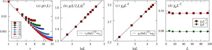 image: Evidence for the conjectured scaling form in the example of the critical 4D XY model. (a) Two-point correlation function. (b) Two-point correlation at the distance of half of the linear system size. (c) Magnetic susceptibility. (d) Magnetic fluctuations at non-zero Fourier modes.
