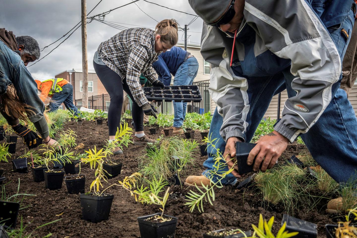 image: The National Wildlife Federation and partners are installing climate-adapted pollinator gardens in Philadelphia; their work differs from business-as-usual conservation by altering their planting mix to include a greater diversity of native species that are well-suited to future climate conditions, for example by being drought- and heat-tolerant
