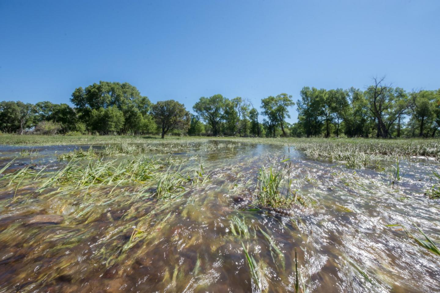 image: Flood irrigation creates wetland habitats when the water flows over the landscape. Photo courtesy of Ryan Scavo.